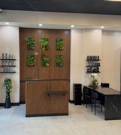 Our story began with a commitment to excellence and a passion for precision. Danny personally designed the salon’s interior to reflect this, featuring a sleek, forest modern aesthetic with black paint, dark wood accents, and welcoming plant life.